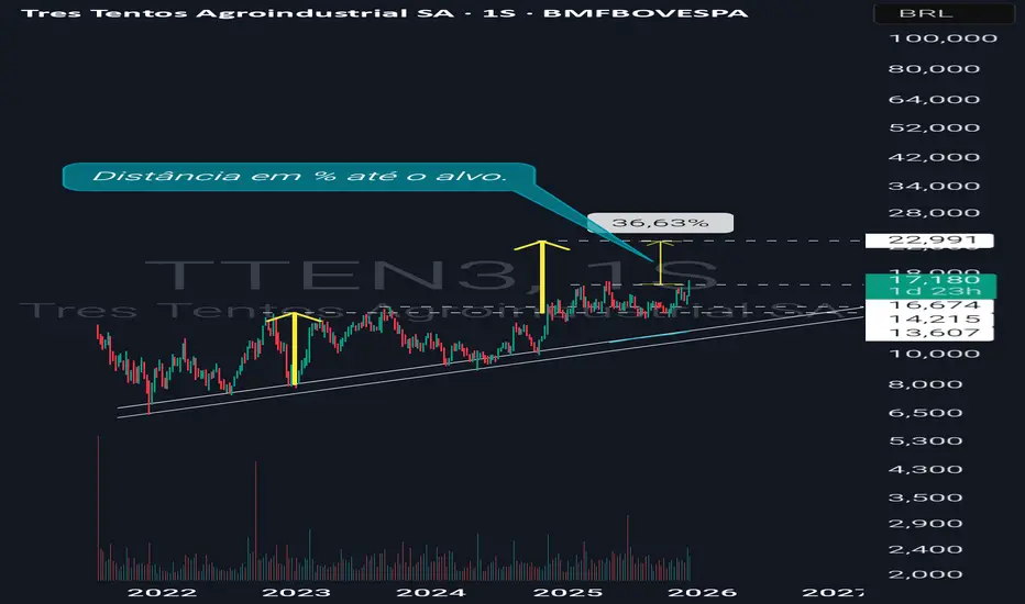 Pelo gráfico semanal, TTEN3 formou um triângulo ascendente composto por uma linha horizontal de resistência e uma linha de tendência de alta. O preço chegou a romper essa resistência, mas depois lateralizou por cerca de um ano dentro do range entre R$13,50 e R$16,70. Agora o ativo parece estar rompendo essa faixa de consolidação, embora o candle semanal ainda não tenha fechado, o que exige atenção antes de confirmar a quebra dessa estrutura.