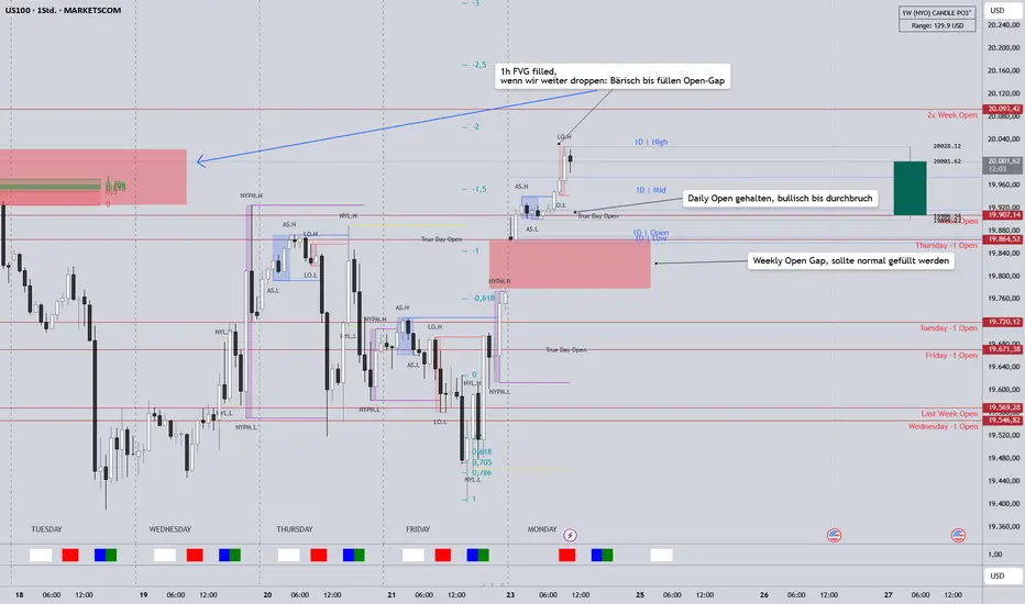 Starker Push von Beginn an, wir sind über dem Weekly Open und haben nun (endlich) die 1h Gap von vor 1.5 Wochen geschlossen und danach Gibt es gerade einen Abverkauf.