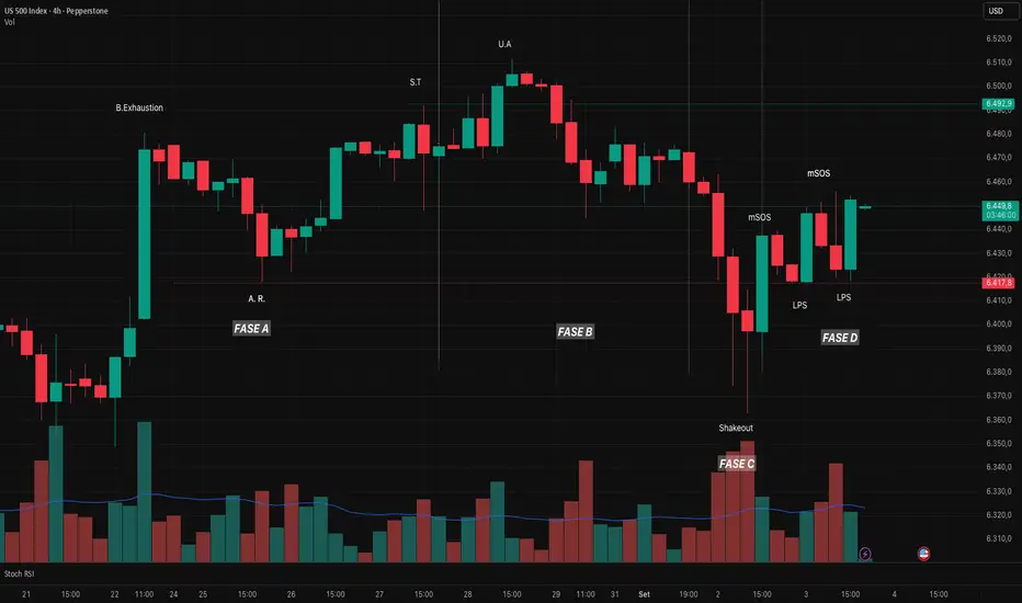 A contagem Wyckoff volta ao centro do radar com um possível cenário de reacumulação no gráfico de 4H do SP500.