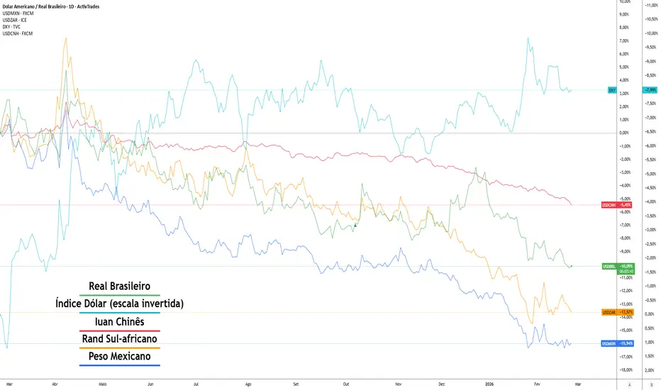 Se ampliarmos a lente para mercados emergentes, o quadro fica ainda mais claro. Não é só o real que está se valorizando; por exemplo, o peso mexicano, rand sul-africano, iuan chinês e outras moedas emergentes também vêm ganhando terreno frente ao dólar. Isso aponta para uma rotação de fluxo internacional em direção a ativos de maior risco, geralmente estimulada por expectativa de juros mais baixos nos Estados Unidos ou menor percepção de risco sistêmico.