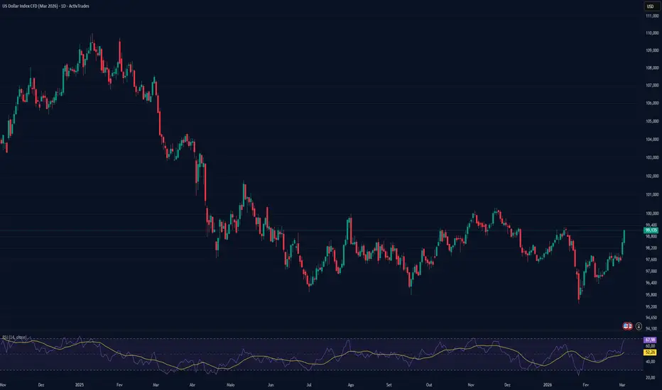 O índice do dólar norte-americano, que mede o seu desempenho face a um cabaz de principais moedas, subiu até agora mais de 1,4% esta semana em relação ao fecho de sexta-feira. Os ganhos surgem à medida que os investidores reagem ao impacto da guerra no Médio Oriente, particularmente nos mercados energéticos. Uma consequência imediata do conflito foi o encerramento do Estreito de Ormuz, interrompendo as exportações de petróleo e gás natural a partir da principal região produtora mundial e aumentando os receios de que um confronto prolongado possa desencadear um choque energético global. Tal cenário implicaria, muito provavelmente, uma subida acentuada dos preços do petróleo e do gás, reavivando pressões inflacionistas. Neste contexto, o dólar norte-americano beneficia de dois importantes fatores de suporte. Em primeiro lugar, o seu estatuto de ativo de refúgio reforçou-se, uma vez que os investidores continuam a valorizar a liquidez do dólar em períodos de maior turbulência e incerteza. Em segundo lugar, a perspetiva de preços globais de energia mais elevados levou a uma reavaliação da trajetória da política monetária da Reserva Federal, com as expectativas de três cortes de taxas em 2026 a começarem a esbater-se num cenário de maior inflação.