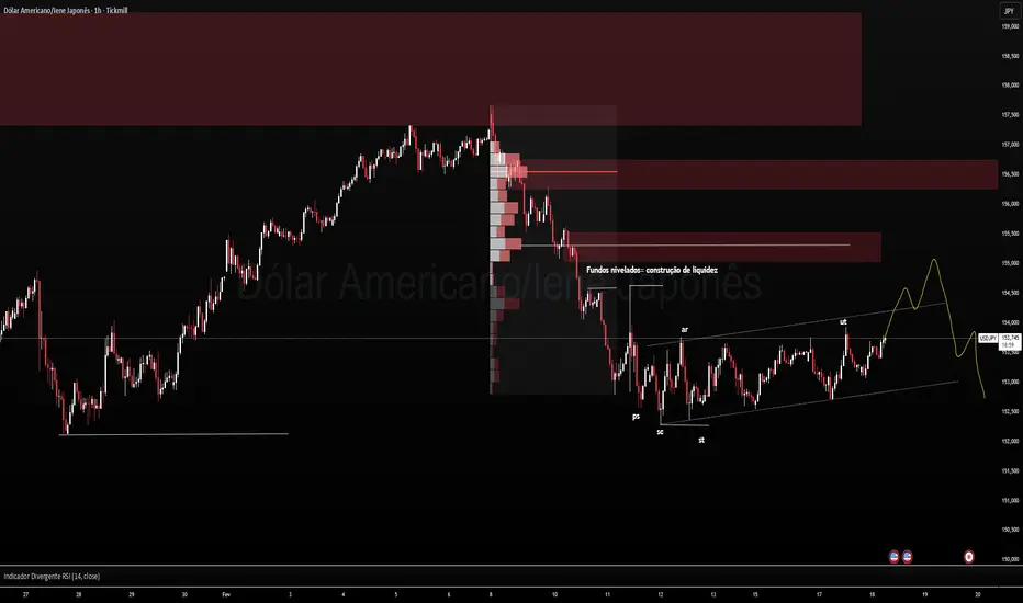 Após um movimento impulsivo de baixa, o ativo desenvolve uma estrutura corretiva dentro de um canal levemente ascendente. A perna vendedora anterior demonstra clara dominância da oferta, seguida por uma fase de consolidação com topos e fundos progressivamente mais altos, porém com característica corretiva e perda de momentum comprador.