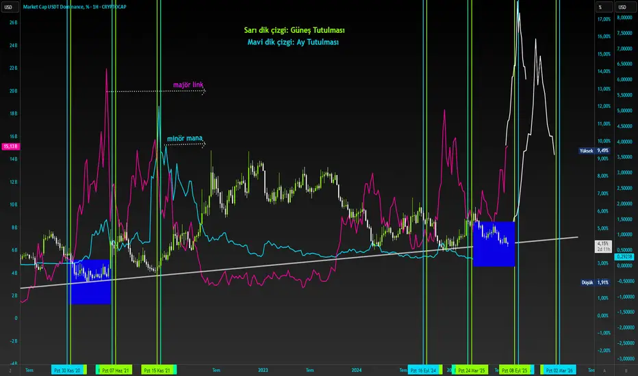 Lacivert alanda link yine çıkışını yapıyor ve güneş tutulmasına kadar artış gözüküyor. Güneş tutulması öne geçince kademeli ayı gelecek arkadaşlar. Biliyorsunuz ki; Güneş ve ay analizi bitcoin için yapılıyor. Altcoinler bitcoin tepede durunca artar. Bu yüzden 18 eylülden sonra bitcoin son ath ile tamamlanıp sezonunu altcoinlere devreder. Eth de durduğu an minör coinler sahneye gelir. Şimdi 18 eylüle kadar majör alanında olup 18 eylülde sert bir düşüş ardından kripto paralarda talep kayması ve minör coin geçiş aşaması gerçekleşir. ocak sonu gibi de komple düşüş bölgesinde olabiliriz. Zamansal olarak baktığınız zaman bu süreç 2 3 hafta sürer. Kasımda xrp 3 haftada tepe yaptığı için yine coinlerde aynısını yapacak.