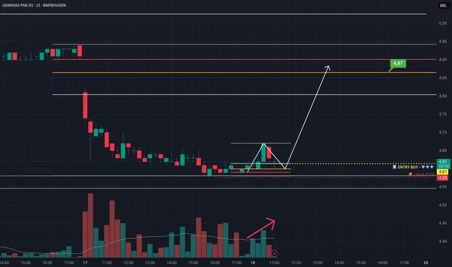 O ativo USIM3 está configurando uma possível reversão de curto prazo, com estrutura técnica favorável para compras, desde que o preço sustente acima de 4,61 e confirme com volume na abertura.