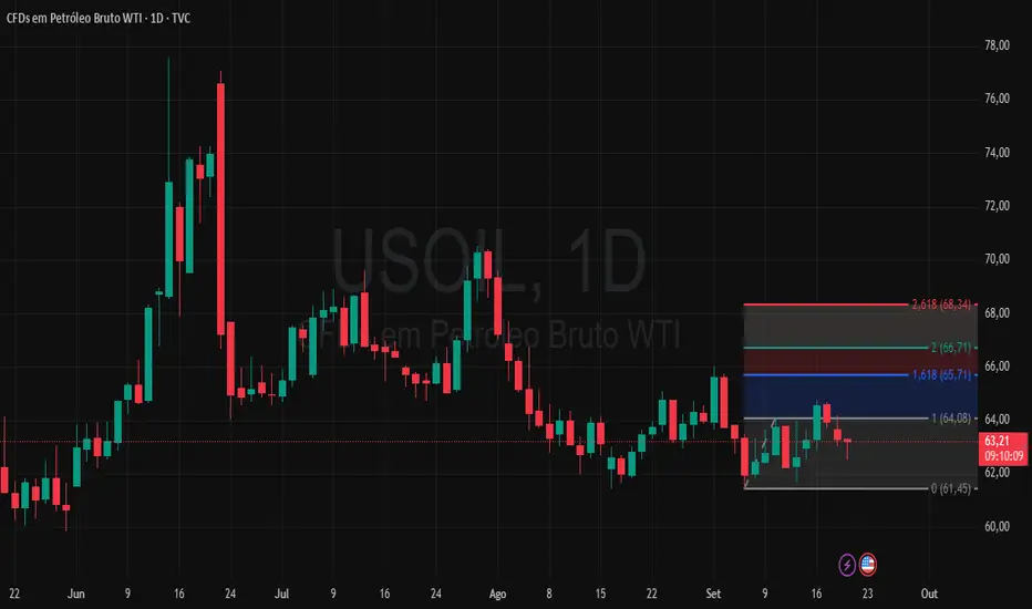 No gráfico diário do USOIL, rompeu o pivô armado, retraiu (pode retrair mais, até 100%) e poderá voltar a subir até o(s) seu(s) alvo(s).