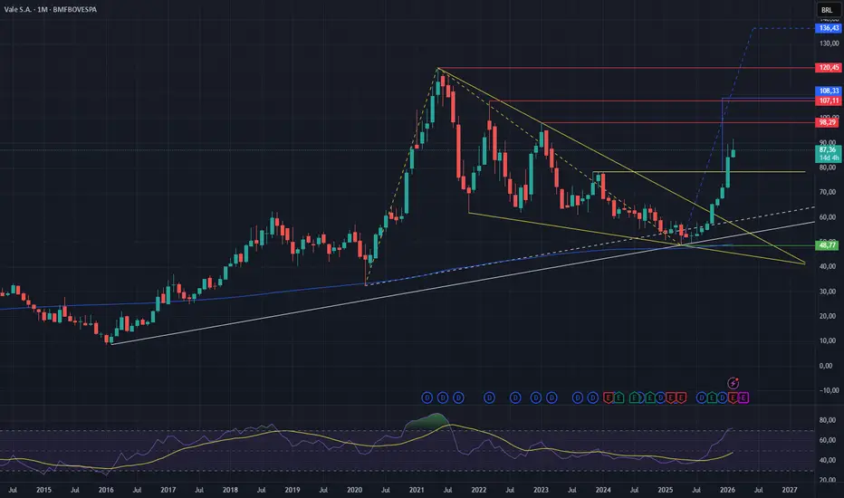 2º) Padrão Pires — utilizando como base o terceiro ponto da Linha de Tendência de Alta, com zona de resistência rompida pelo candle mensal de janeiro de 2026. A projeção desse padrão aponta para o alvo em R$ 108,33.