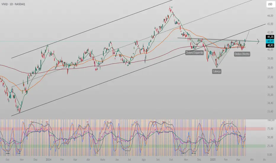 O VNQI (Vanguard Global ex-U.S. Real Estate ETF) pode estar apresentando uma configuração técnica interessante: a formação de um padrão de Ombro-Cabeça-Ombro Invertido. Este padrão é conhecido por sinalizar uma possível reversão de tendência de baixa para alta.