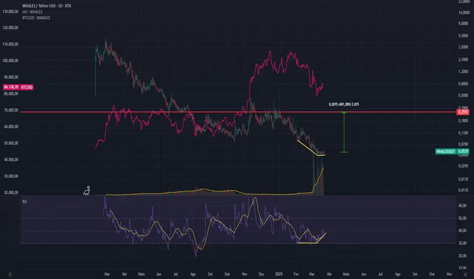 agora sobre o token, Ele veio em uma tendência de baixa severa desde o lançamento, enquanto o BTC estava lateral se preparando para romper os 70K... depois do rompimento ele também subiu junto com o BTC, e agora ele esta nas mínimas, o mais legal é o Volume que esta absurdamente alto, RSI mostrando divergência.