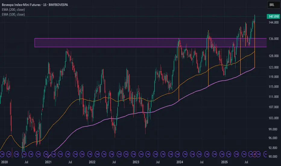WINFUT está distante de 20% da MME200 no semanal. Isso Indica possível retorno à MME100 (130k), podem ir até a MME200 (122k, baixa probabilidade). Há um suporte forte na região dos 136k-131k, composto por topos anteriores e Order Block. Viés de venda, mas com cautela. Mercado puxando muito forte na compra durante a última semana.