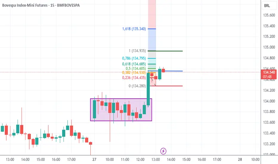 Podemos notar o rompimento de uma zona de consolidação com uma barra elefante com bastante força, a ideia é entrar na ponta da compra, após o rompimento do recuo, traça-se uma retração de fibonaci, cujo alvo é "1" da retração já para quem deseja alongar seria no 1,6 stop seria na mínima da retração.