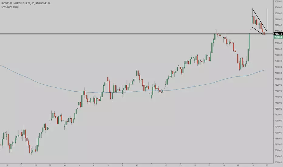Possível formação de cunha descendente no gráfico de 60min, definição da figura é representada no respeito do suporte na zona de 78500 e no rompimento do 79400 podendo completar o movimento acima dos 80.000.