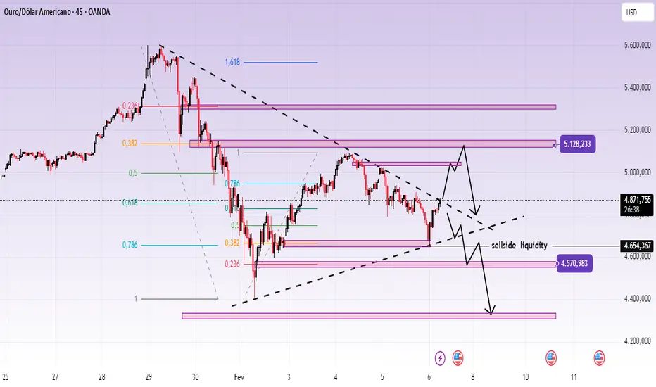 Se o preço não conseguir se manter no suporte em alta, o ouro pode cair para 4,570–4,550 para limpar a liquidez do lado vendedor. Tal movimento provavelmente seria corretivo, não uma reversão de tendência, especialmente dado o cenário macroeconômico.