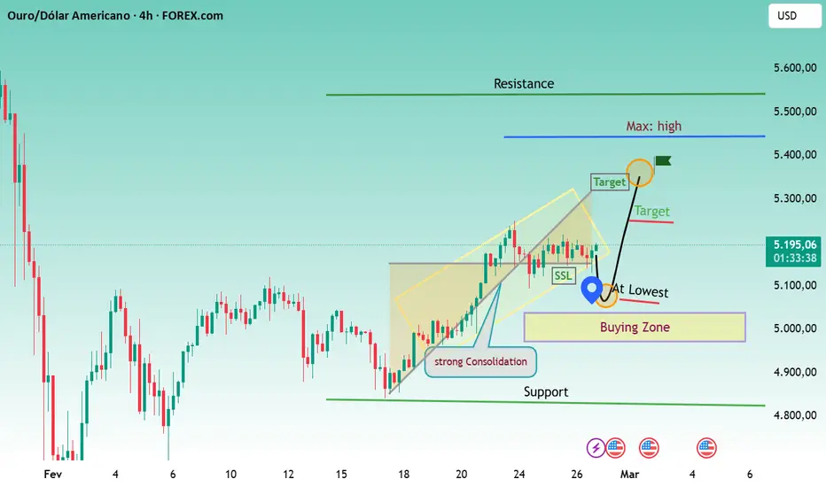 O ouro está comprimindo abaixo de uma zona de oferta de timeframe superior após um forte impulso de alta, mantendo a estrutura de mínimas ascendentes intacta. A zona de demanda 5.000–5.100 continua absorvendo pressão vendedora, indicando acumulação em vez de distribuição.