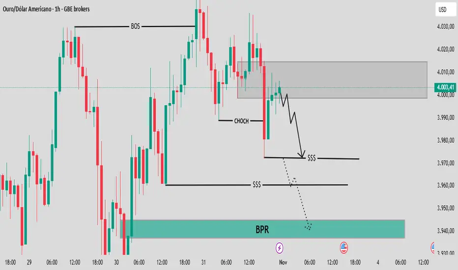 XAU/USD 1H– Varredura baixista de liquidez em direção à zona BPR