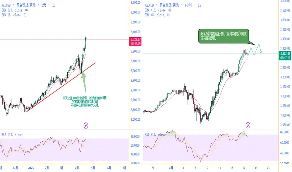 这是一波急速上涨的行情,在复活节假期前期,容易出现多头获利料及,在欧美盘时间,很容易出现诱多行情后回落!