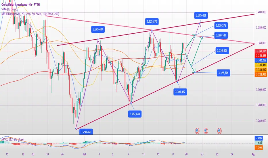 Resistência principal: 3377-3380 (máxima anterior), alvo após rompimento em 3400-3430.