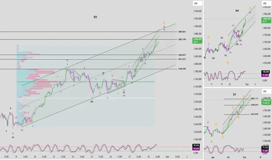 No entanto, o momentum no H4 permaneceu em sobrecompra por 4 velas consecutivas → sinal de que a onda 5 (roxa) está na fase final.