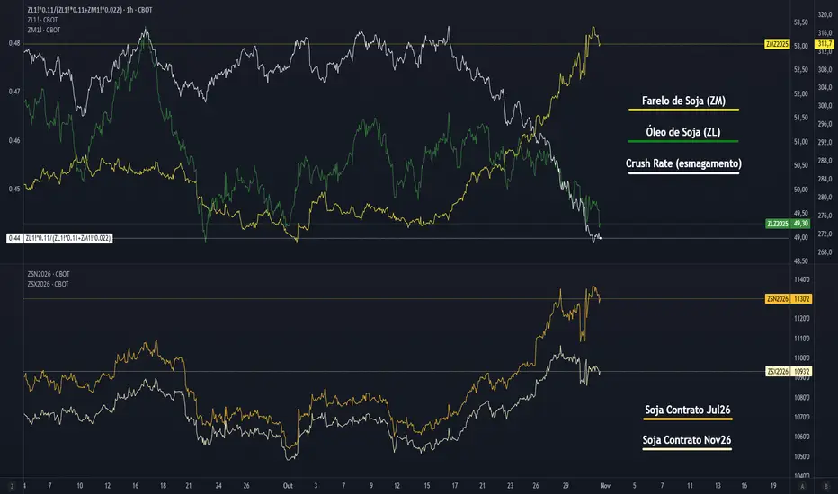 A divergência entre farelo e óleo mostra uma demanda assimétrica com o setor de ração sustentando preços enquanto o energético afunda. Isso indica que a alta da soja não está ancorada em fundamentos industriais sólidos, mas em um choque temporário de subproduto. Se o óleo não reagir, o movimento de alta do farelo tende a perder força e o preço da soja, mesmo com contratos futuros em leve valorização, pode voltar a se ajustar para reequilibrar o crush.