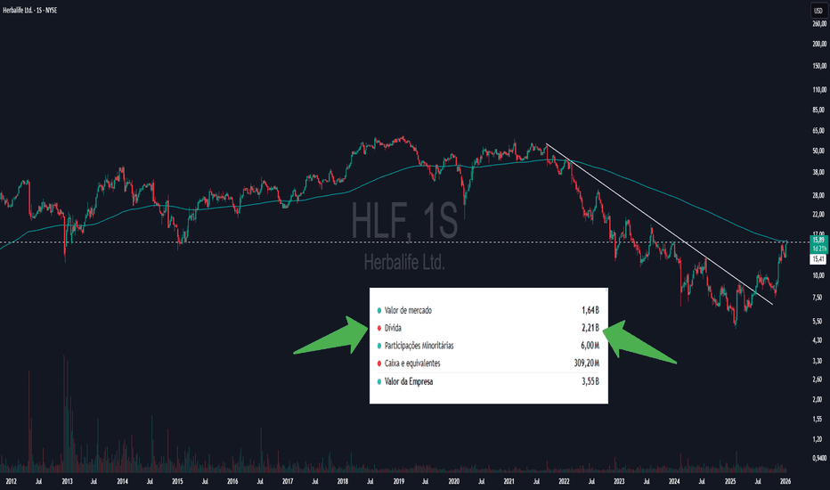 HLF Herbalife em ponto de resistência, gráfico semanal.A Herbalife é uma empresa americana do setor de nutrição e bem estar, conhecida pela venda direta de suplementos alimentares, produtos de controle de peso e cuidados pessoais. Seu modelo de negócios é baseado em marketing de rede e distribuição global, com atuação em diversos países.