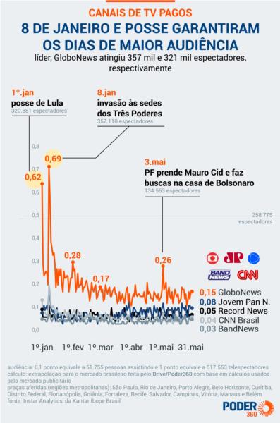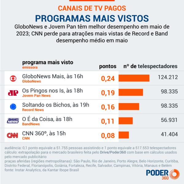 Dados obtidos com exclusividade pelo Poder360 mostram que GloboNews, Jovem Pan News e CNN Brasil encabeçam a lista de audiência de canais dos 5 principais canais de TV pagos de notícias no Brasil. Record News e BandNews completam a lista. Na média, a emissora da família Marinho lidera nos 3 turnos (manhã, tarde e noite). A Jovem Pan vem em 2º à tarde e à noite. Pela manhã, o 2º lugar tem empate entre CNN Brasil e Jovem Pan. Os números são uma média de janeiro a maio de 2023.