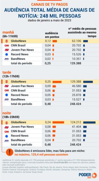 De janeiro a maio, A GloboNews teve 129.388 espectadores, em média, assistindo à sua programação no período da tarde (das 12h-17h59). Quando se consideram as audiências médias de todas as 5 emissoras de TV por assinatura de notícias nos primeiros 5 meses de 2023, pela tarde, chega-se a apenas 248,4 mil.