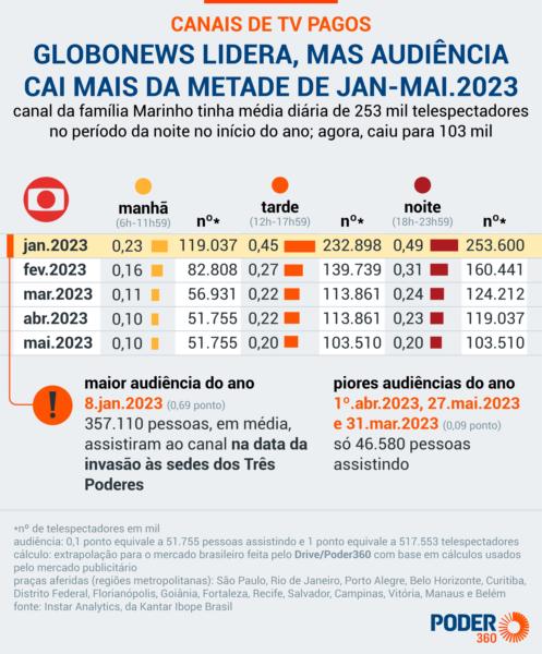 O infográfico abaixo mostra a audiência por mês do canal fechado da família Marinho. Os dados vão de janeiro a maio de 2023. Apesar de ter o melhor desempenho entre as emissoras, há uma tendência clara de queda desde o início de 2023.