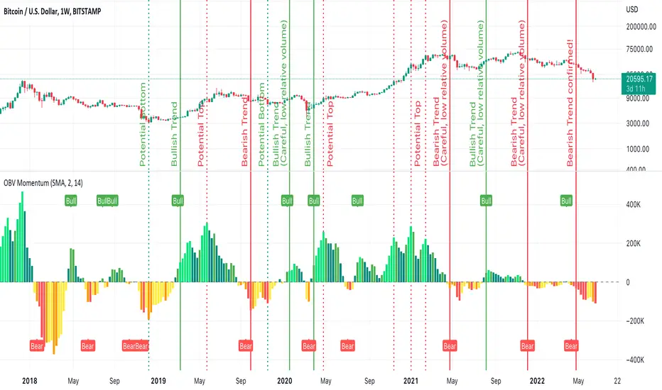 "OBV Momentum" is a trend momentum indicator, that can be used to identify strong trends and also trend changes based on volume.