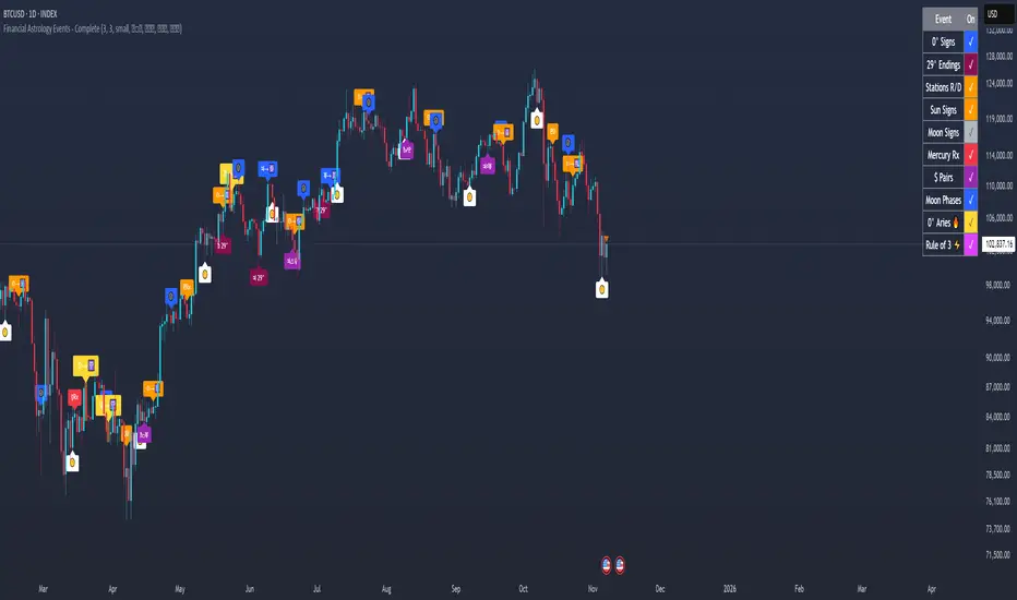 This indicator marks critical astronomical events that correlate with significant market movements, based on established principles of financial astrology and planetary cycle analysis.