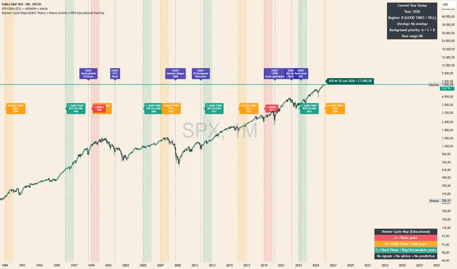 This script is an educational overlay that visualizes the classic Benner Cycle “A/B/C” year map (as presented on the historical Benner card) and optionally plots a curated set of major macro/market events (e.g., 1929 Crash, 9/11, Lehman, COVID) for historical context.