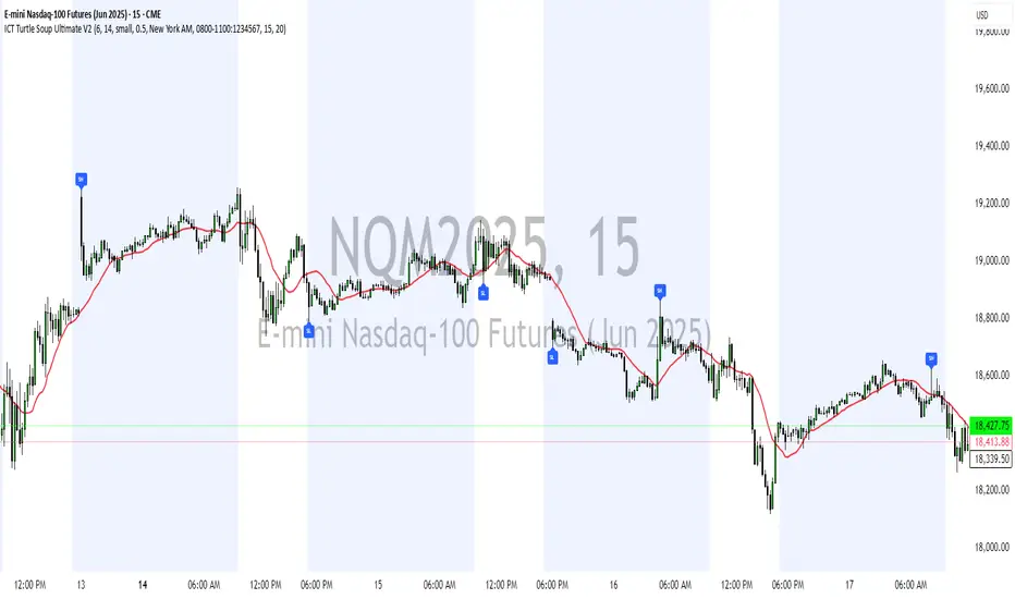 The ICT Turtle Soup Ultimate V2 is a next-generation liquidity reversal indicator built on the principles of smart money concepts (SMC) and the classic ICT Turtle Soup setup. It is designed to detect false breakouts (liquidity grabs) at key swing points, enhanced by proprietary logic that filters out low-quality signals using a combination of trend context, kill zone timing, candle wick behavior, and multi-timeframe imbalance zones.