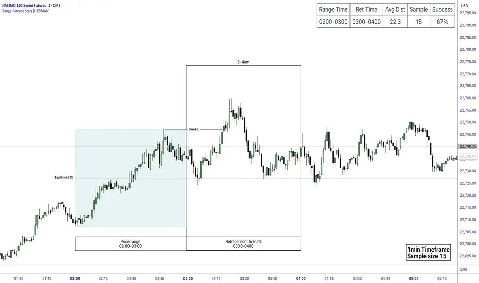 This indicator is designed to help traders quantify how often price retraces to a selected equilibrium level (e.g., 50%) after sweeping the high/low of a defined time-based range.
