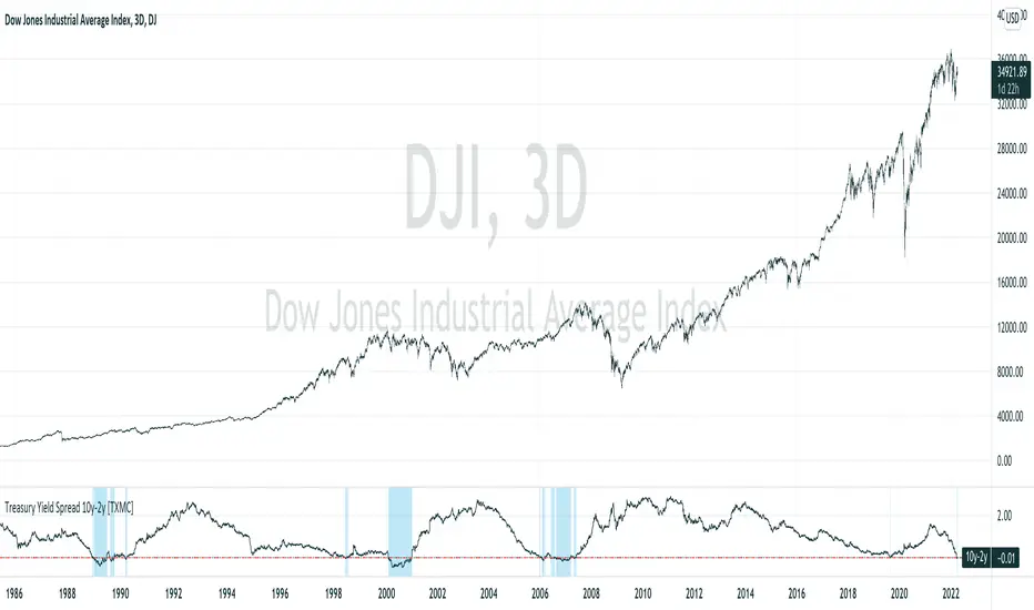 A simple indicator to show inversions of the US Treasury yield curve, specifically between the 2yr and 10yr yields.