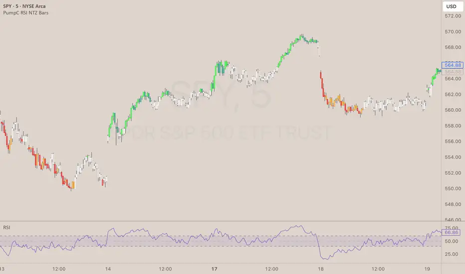 The PumpC RSI NTZ Bars indicator builds on the classic RSI by combining it with slope detection and custom bar highlighting, helping traders quickly identify strong momentum breakouts while avoiding sideways chop — the (NTZ) or No Trade Zone.