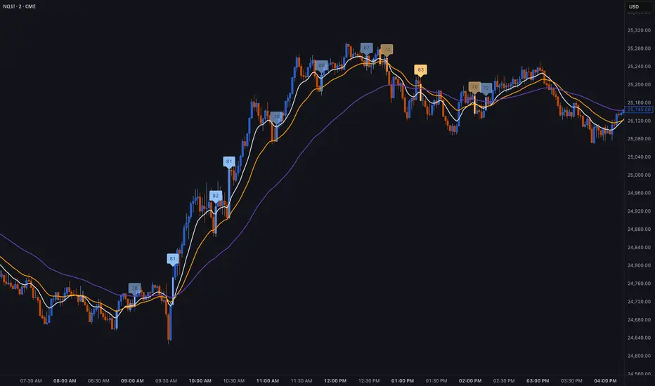 BT Ligma detects high-intensity reversal candles that cross through key moving averages (9, 21, 55). These “Ligma Events” signal strong momentum shifts and are validated using spread compression, slope trending conditions, and an Aggression Score (LSI). The result is early but reliable reversal confirmation.