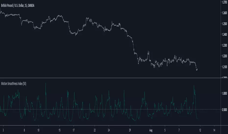 The indicator is in an approximate range of (0,1) with mean x̄ decaying for higher length's, when the indicator is below 0.5 the market is smooth, else rough, this is the simple interpretation. The indicator is simply the ratio of the price residual standard deviation and the price standard deviation.