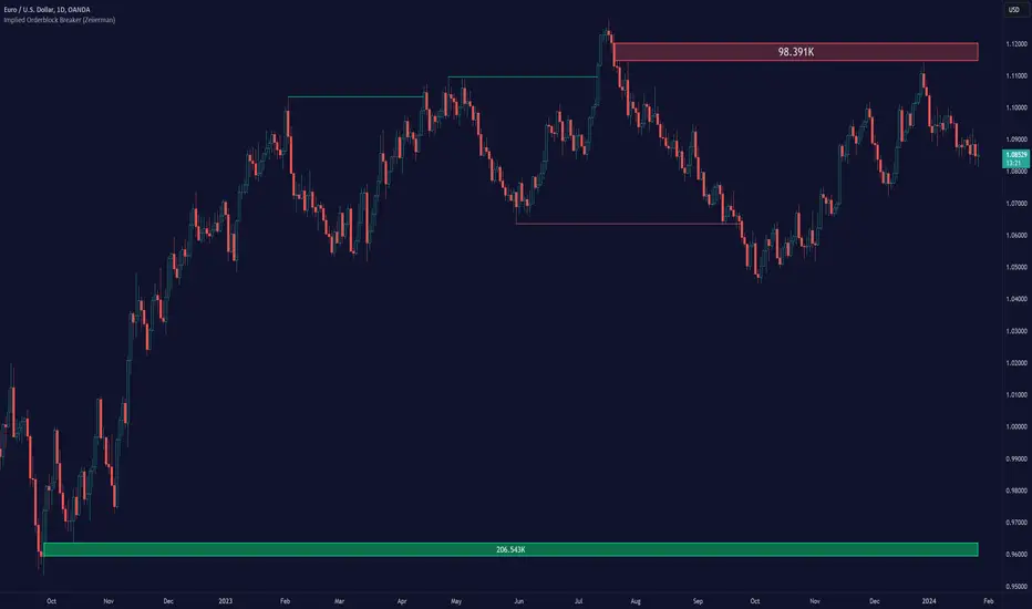 The Implied Order Block Breaker (Zeiierman) is a tool designed to identify enhanced order blocks with imbalances. These enhanced order blocks represent areas where there is a rapid price movement. Essentially, this indicator uses order blocks and suggests that a swift price movement away from these levels, breaking the current market structure, could indicate an area that the market has not correctly valued. This technique offers traders a unique method to identify potential market inefficiencies and imbalances, serving as a guide for potential price revisits.