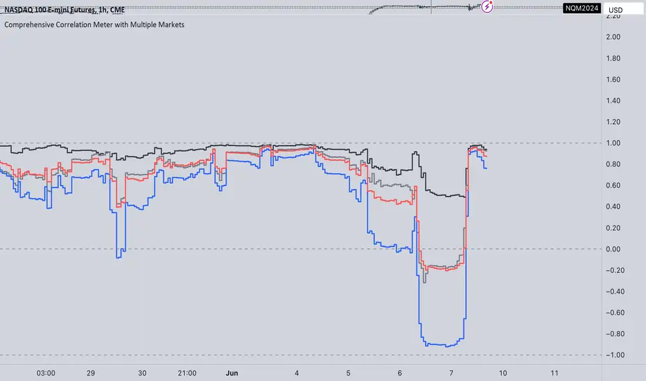 The Comprehensive Correlation Meter is designed to provide traders and investors with insights into the relationships between multiple financial instruments. This script expands upon an existing idea on TradingView about correlation by introducing the ability to analyze the correlation between three markets, offering deeper insights into market relationships. It helps users understand how these markets move in relation to each other, aiding in risk management and portfolio diversification.Key Features:
