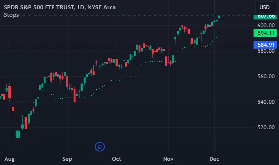 This indicator is developed from a description outlined in the Chande - Kroll book, "The New Technical Trader". It is designed to help control risk by plotting two lines that function as long and short trailing stops.