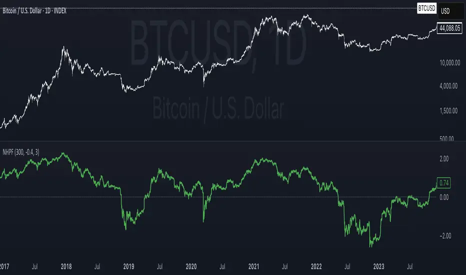 This indicator applies a normalized Hodrick–Prescott filter (NHPF) to Bitcoin’s price data. It separates the underlying trend from short-term cyclical fluctuations by recursively smoothing the price using a user-defined lambda (HP Filter Period). The raw trend is then normalized by calculating a ratio between the trend and the current price, which is scaled and shifted according to subjective parameters (Mean and Scale). The result is a dimensionless value that highlights deviations from the long-term trend—serving as a signal for potential overbought (positive values) or oversold (negative values) market conditions. A zero line provides a clear reference, allowing traders to visually gauge when Bitcoin’s price is significantly above or below its expected trajectory.
