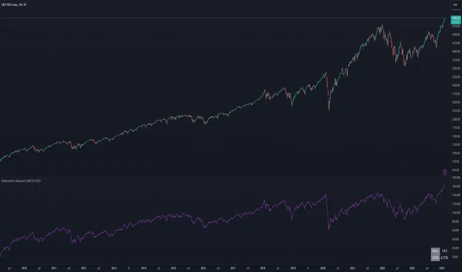 Our indicator offers a unique perspective by adjusting the current ticker price for the M2 money supply and normalizing this data to show the percentage appreciation since the first visible bar on the chart. Users can also select alternative money supply measures, such as the EU-M2, via the indicator's settings.