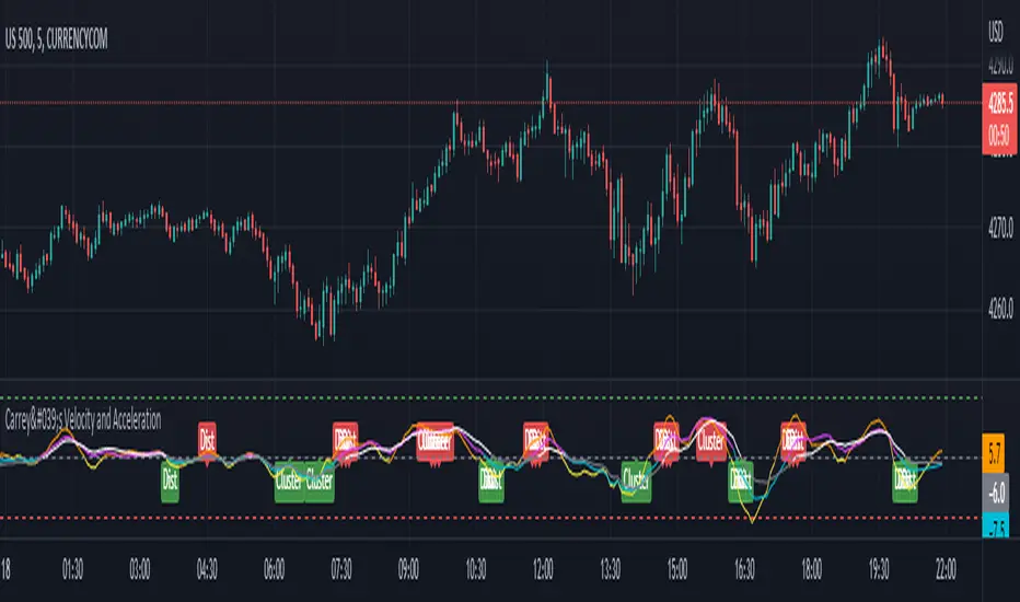 This is initially based on the MA Speed indicator from TradeStation (tradingview.com/v/4j9HWCVA/) and expanded upon greatly. This implements 3 different variable MAs and calculates and plots both speed and acceleration of each. Also, a single line composite option is included for both speed and acceleration that changes color based on directional confluence of each MA's speed/acceleration. Additionally, optional labels are included to show where the 3 MAs are clustered, and a volatile move is expected, and where they are more distributed, expecting a temporary reversal.