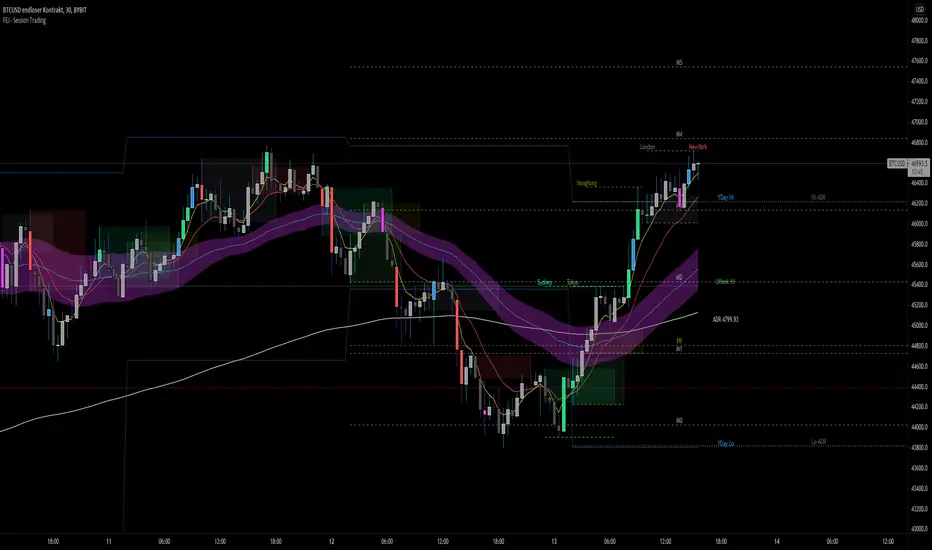 Dieser moderne Indikator zeigt zukünftige Sessions, viele EMA Level, Tages und Weekly durchschnittliche Ranges sowie die aktuelle Priceaction der Candle an.