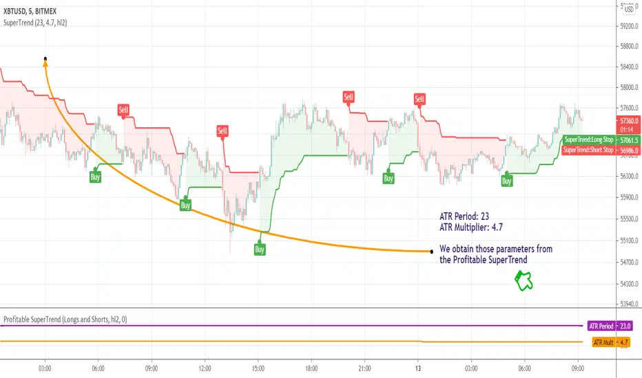 Each configuration is backtested across the instrument's full history, and when a more profitable setup is identified, the indicator automatically switches to those values in real time — while preserving the standard SuperTrend logic.