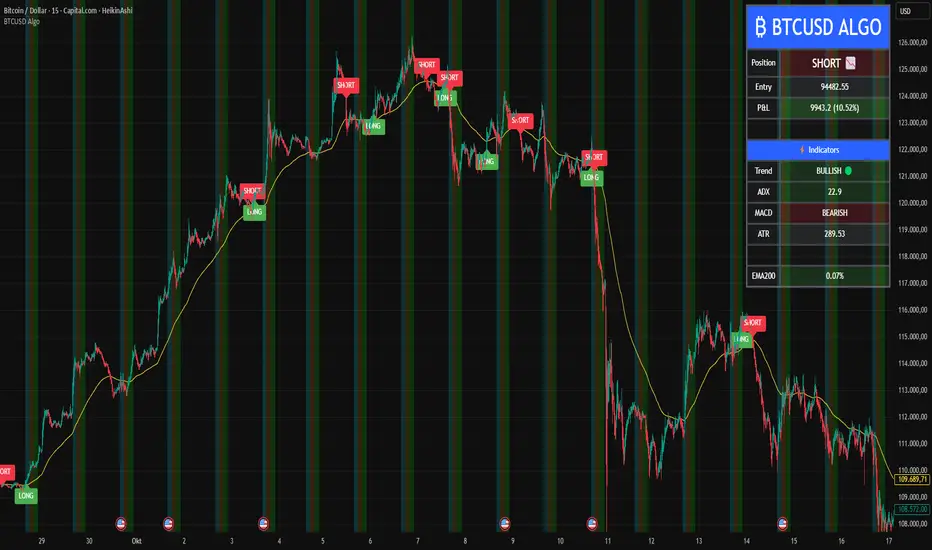 Advanced algorithmic trading strategy specifically designed for BTCUSD 15-minute Heikin Ashi charts. This algorithm combines the powerful Supertrend indicator with multiple technical filters to identify high-probability entries in the Bitcoin market.