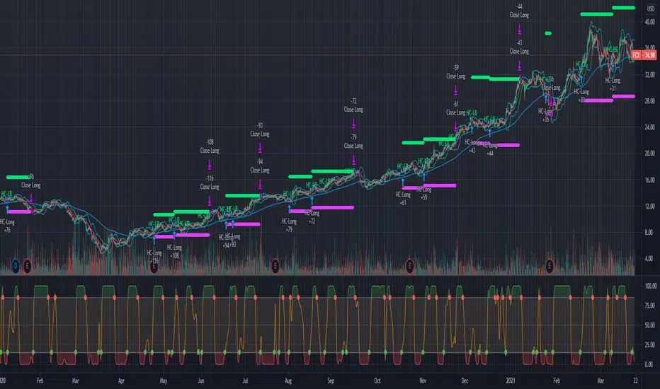 I added the ability to run the strategy only in the trending up, down, or both directions.I added the ability to apply a trailing stop and display the exit conditions on the chart.