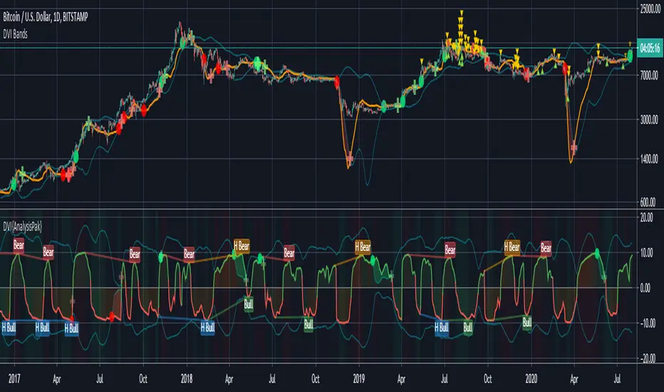 The DVI can be re-scaled and whenever its value > 100, a background fill between the oscillator and the zeroline appear to indicates overbought condition; and < -100 indicates oversold condition. The user can tweak the scaling factor to optimize this for a given chart and timeframe.