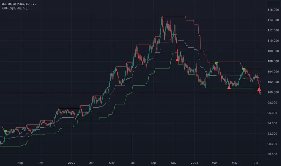 To illustrate a simple Donchian trading system, this script calculates and plots the channel lines, as well as potential entry points for long positions (green triangles) and short positions (red triangles).