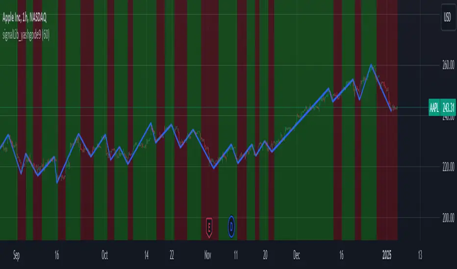 To use this library, you can call the "signalLib_yashgode9" function and pass in the necessary parameters, such as the lower and higher prices, the depth of the analysis, the deviation threshold, and the number of bars to consider for the trend direction. The function will return the direction of the market (1 for bullish, -1 for bearish), as well as the zee1 and zee2 chart points.You can then use these values to generate buy and sell signals in your trading strategy. For example, you could use the direction value to determine when to enter or exit a trade, and the zee1 and zee2 chart points to set stop-loss or take-profit levels.