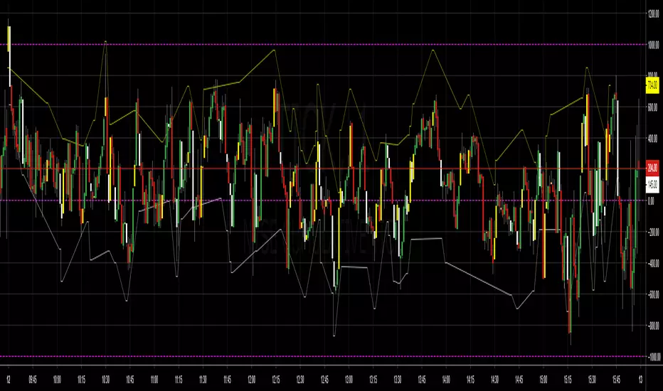Used with the "Cumulative TICK", highlights a gap up candle in yellow and a gap down candle in white, then plots a line 500 points away, signalling a counter trend entry.