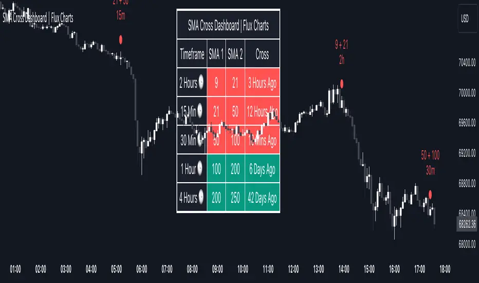 Introducing our new Simple Moving Average (SMA) Cross Dashboard! This dashboard let's you select a source for the calculation of the SMA of it, then let's you enter 2 lengths for up to 5 timeframes, plotting their crosses in the chart.